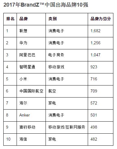 WPP和凱度華通明略聯手Google發布了首期“BrandZ中國出海品牌30強”排行榜及報告。聯想以1,682的品牌力得分一馬當先,成為最強大的中國出海品牌。緊隨其后的是,華為(1,256)以及阿里巴巴(1,047)。報告指出,消費者對中國產品的負面認知正在下降,互聯網驅動品牌潛力巨大,中國品牌行動速度往往快于西方品牌。(美通社,2017年1月10日北京)