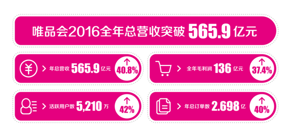 唯品會今天公布了截至2016年12月31日未經(jīng)審計的2016年第四季度及全年財務(wù)報表。財報顯示,唯品會在2016年全年總營收565.9億元人民幣,同比增漲40.8%;毛利潤136億元,較上年同期增長37.4%;唯品會全年活躍用戶數(shù)同比勁增42%,達到5210萬。第四季度,唯品會季度凈營收達到189.8億元人民幣,同比增長36.5%,遠超過預(yù)期水平。(美通社,2017年2月21日廣州)