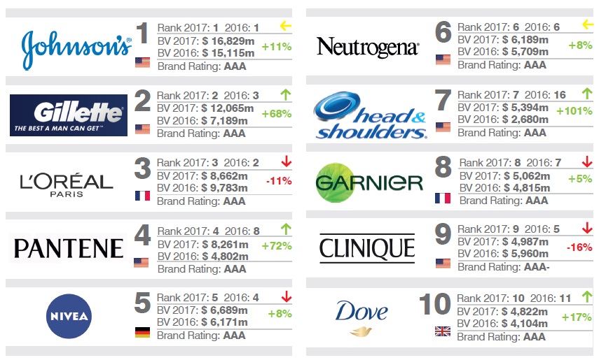 英國(guó)知名品牌評(píng)估機(jī)構(gòu) Brand Finance 近日公布 2017年“全球最有價(jià)值 50大美妝品牌”榜單。強(qiáng)生消費(fèi)品集團(tuán)旗下品牌強(qiáng)生(Johnson’s)超越連續(xù)三年蟬聯(lián)榜首的法國(guó)美妝巨頭歐萊雅集團(tuán)旗下品牌巴黎歐萊雅(L’Oreal Paris),以168.29億美元,名列第一位。名列第二位的吉列(Gillette)品牌價(jià)值為120.65億美元。巴黎歐萊雅(L'Oreal Paris)品牌價(jià)值下滑至86.62億美元,名列第三位。在50強(qiáng)品牌中出現(xiàn)最多的還是歐萊雅集團(tuán)、寶潔集團(tuán)、強(qiáng)生集團(tuán)和聯(lián)合利華集團(tuán)旗下的品牌。強(qiáng)生消費(fèi)品集團(tuán)此次表現(xiàn)出強(qiáng)勁的實(shí)力,有6個(gè)品牌上榜。(美通社,2017年5月11日上海)