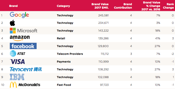WPP和凱度華通明略今日發(fā)布了“2017年BrandZ最具價值全球品牌100強”排名,結果顯示,品牌價值位居前五的均為科技巨頭,分別為谷歌、蘋果、微軟、亞馬遜和Facebook 。其中,亞馬遜在所有100強品牌中實現(xiàn)了最高的價值增長,品牌價值增長了403億美元(增長41%),達到1393億美元,排名上升至第四位。今年在排行榜上頗為矚目的還有騰訊(排名第八),其社交平臺微信的用戶量持續(xù)上升,品牌價值增長了27%,達到1083億美元,排名首次進入前十。