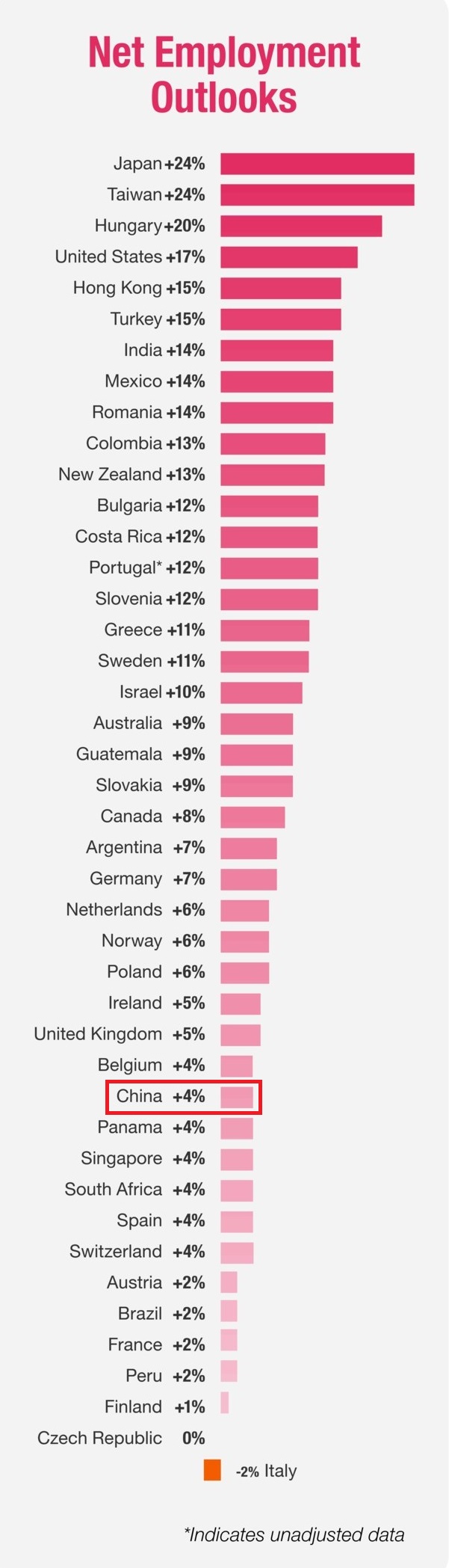 萬寶華盛ManpowerGroup最新的雇傭前景調(diào)查顯示,2017年第三季度,受調(diào)查的43個(gè)地區(qū)中,有41個(gè)地區(qū)的雇主計(jì)劃擴(kuò)大招聘。其中,招聘意愿最強(qiáng)烈的地區(qū)是日本、臺(tái)灣、匈牙利和美國(guó),而意大利、捷克、芬蘭等地的雇主招聘意愿最低。亞太地區(qū),中國(guó)和新加坡兩地的雇主招聘意愿最低。(美通社,2017年6月11日洛杉磯)