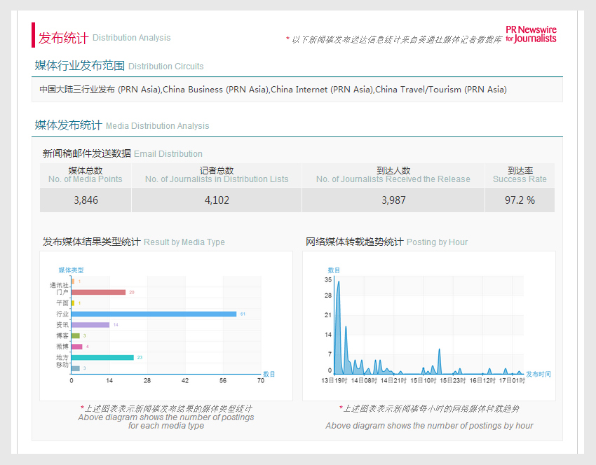 a、對(duì)新聞稿郵件在24小時(shí)內(nèi)的發(fā)送數(shù)據(jù)進(jìn)行統(tǒng)計(jì),包括在美通社PRNJ媒體數(shù)據(jù)庫中發(fā)布所覆蓋的媒體數(shù)量、記者數(shù)量,方便客戶直觀了解稿件發(fā)送的媒體覆蓋與到達(dá)情況。