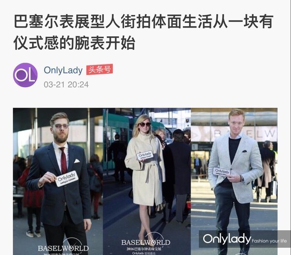 腕表是商務場合的必備單品,OnlyLady針對這一職場人士巨大的需求,特別派出精英團隊在報道前線打造巴塞爾表展精致商務街拍,倡導“體面生活從一塊腕表開始”的理念