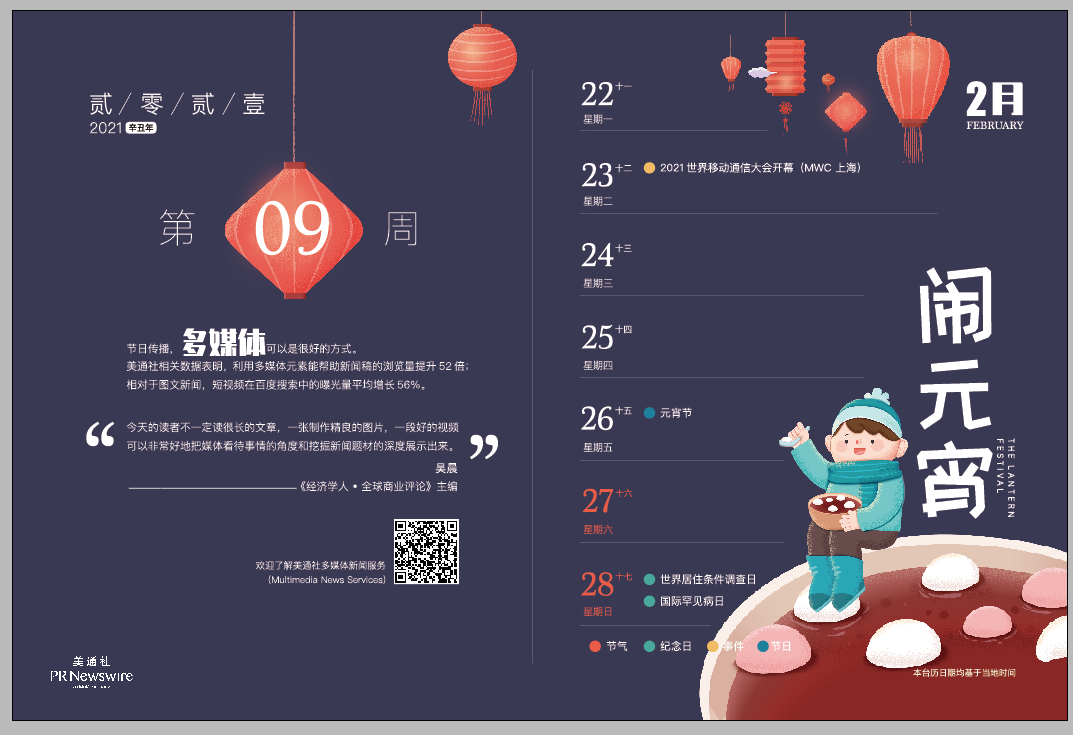 每位填寫問卷的媒體人士也將免費獲得美通社原創的《2021美通社媒體日歷》一份。美通社媒體日歷每年都會植入媒體人未來一年關注的大型重要日子,活動,熱點事件等,方便媒體人提前制定采訪計劃和安排。2021年媒體日歷首次將日歷呈現改為以周為單位,更加匹配媒體人士周期性的工作習慣。