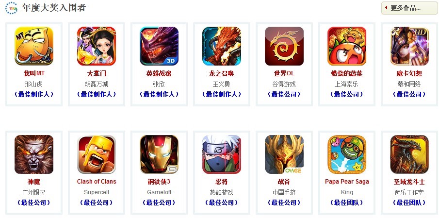 從9月1日啟動報名以來到10月20日天府獎截止報名為止,組委會已先后收到CMGE中國手游的《戰(zhàn)谷》、樂動卓越《我叫MT》、玩蟹科技《大掌門》、掌上明珠的《圣域龍斗士》、墨麟《秦美人》、索樂的《燃燒的蔬菜》、熱酷的《忍將》、Gameloft的《鋼鐵俠3》、DeNA夢寶谷的《變形金剛》、銀漢的《神魔》、supercell的《Clansh of Clans》以及7K7K《瘋狂的方言》等共計184款游戲角逐本次天府獎的報名申請。