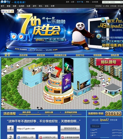 PPTV 網(wǎng)絡(luò)電視七周年慶生活動(dòng)首頁(截止到2011年5月23日晚10點(diǎn))