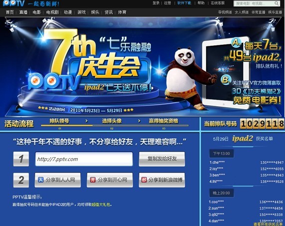 PPTV 網絡電視7周年活動截止時參與人次達到了1029118人