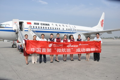 北京2011年7月1日電 /美通社亞洲/ -- 今日上午6:50,包括“月亮美女”黃奕在內(nèi)的百余名“微航客”乘坐由國航發(fā)起的中國首架“微航班”正式從北京啟航飛赴西安助威世界園藝博覽會?;I備了一個月之久,中國民航史上第一個“微航班”終于成功起飛。