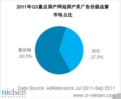 搜房網2011年 Q3房產類廣告價值估算高達2.79億元,占行業整體的62.5%,遠超其他競爭對手。