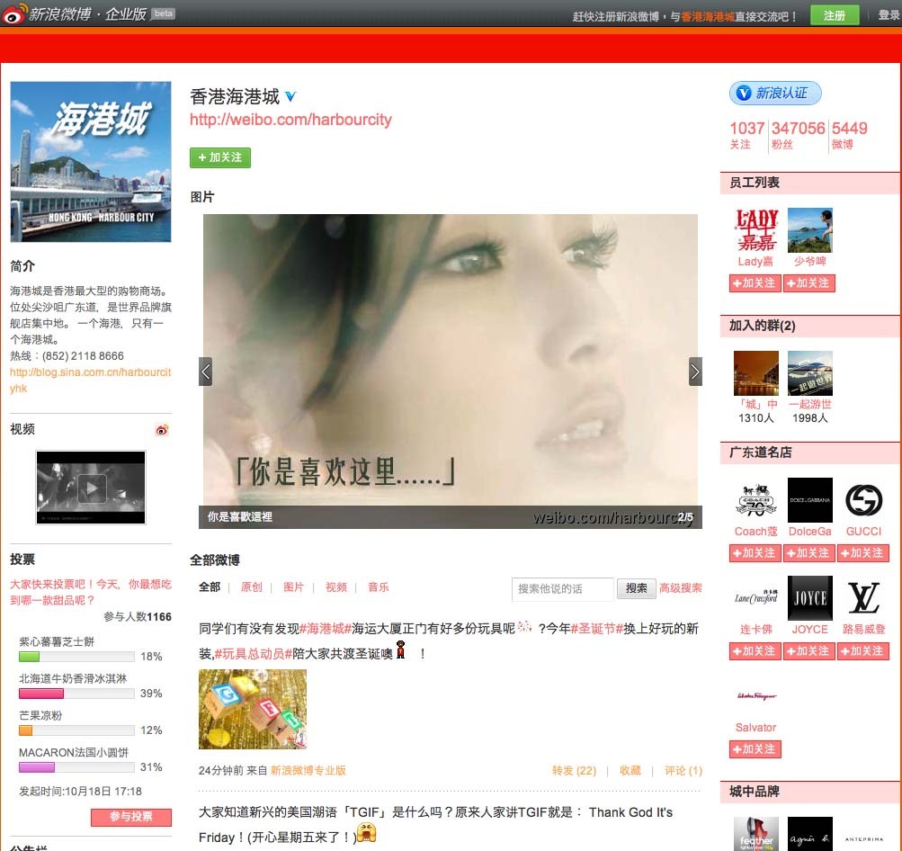作為全香港歷史悠久及較大的商場之一,“香港海港城”一直對中國大陸市場非常重視。香港海港城很榮幸此次能夠與“新浪微博”合作,通過社交媒體為2011年圣誕節進行推廣,借此繼續擴大和提升自己的品牌形象與地位。而新浪微博相關負責人表示,此次達人免費游香港活動是微博旅游體驗產品的有益嘗試,受邀達人將通過微博直播自己的行程,手機客戶端、WAP和微博網三方聯動推廣,寄望通過達人之手傳播香港的文化和繁榮。接下來,“香港海港城”還將舉辦更多類似活動,回饋微博達人。