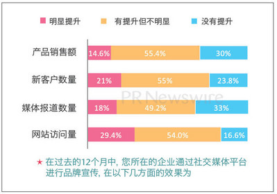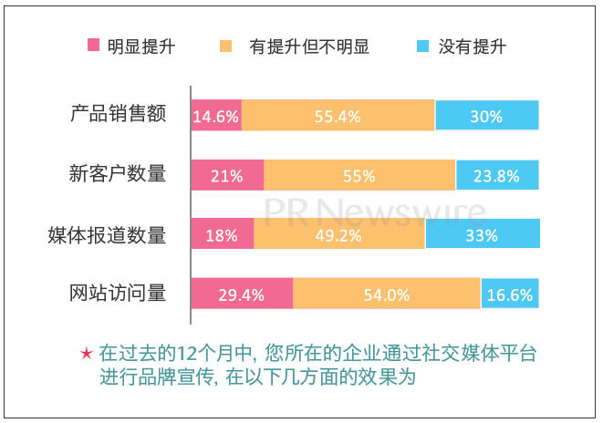 在過去12個月中,有近三成的企業表示社交媒體為企業網站所帶來的流量“明顯上升”,分別有超過半數的企業表示社交媒體平臺為企業帶來的新客戶數量及產品銷售額的影響“有提升但并不明顯”,2成左右的企業表示“有明顯提升”,在“媒體報道數量”方面,有18%的企業表示有“明顯提升”。