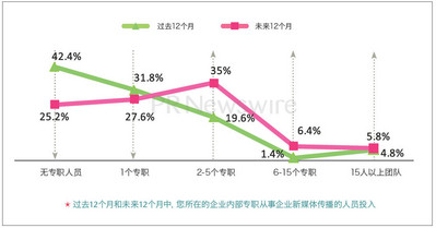 過去12個月和未來12個月中,您所在的企業內部專職從事企業新媒體傳播的人員投入
