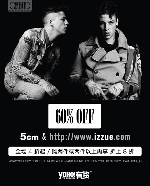 北京2011年12月6日電 /美通社亞洲/ -- 12月1日,YOHO!有貨年度潮流盛宴拉開帷幕,200多個國內外潮牌參加盛大促銷。12月5日至14日,I.T旗下較受歡迎的品牌izzue、5cm專場活動,全場4折起售,購滿兩件還享折上折優惠。