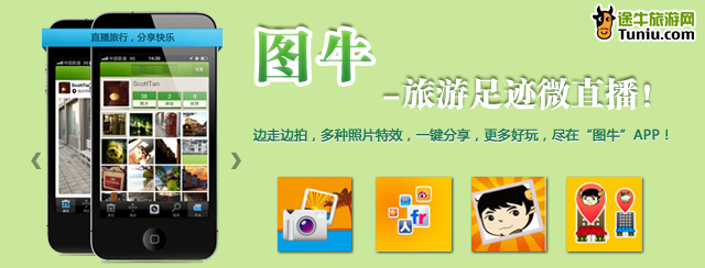 2012年3月,在“途牛旅游”之外,從“游記”更名為“圖牛”的手機(jī)客戶頓嶄新登場(chǎng)。“圖牛”以旅途分享為主,兼具娛樂功能。每一次“圖牛”,其實(shí)就是一次旅游足跡微直播的過程。無論你走到哪里,看到什么樣的風(fēng)景,都可以馬上用攝像頭記錄下來,分享給你的朋友;同一時(shí)刻,雖然可能遠(yuǎn)隔萬(wàn)里,但你的朋友們將會(huì)和你看到同一片風(fēng)景。搜索周邊網(wǎng)友上傳的風(fēng)景圖,幫助你發(fā)現(xiàn)周邊不一樣的美景。“圖牛”是一個(gè)由旅游風(fēng)景構(gòu)成的興趣圖譜,匯聚著更多志同道合的旅游愛好者。