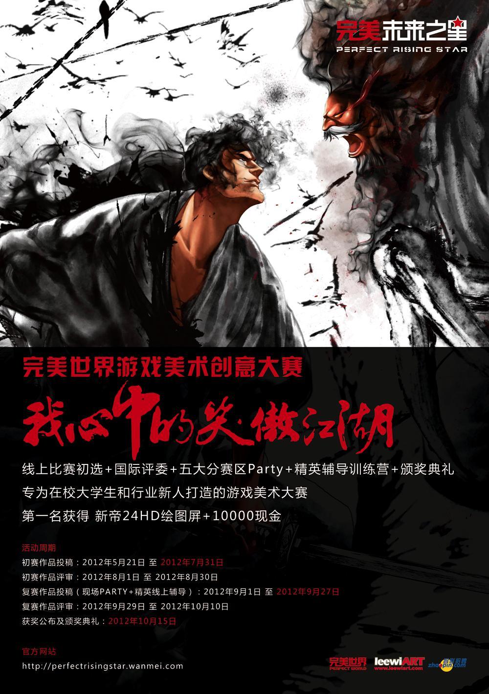 本次比賽是由完美世界主辦,leewiART 國際數字圖形藝術推廣機構與智聯招聘共同承辦的藝術活動。本次活動面向在校大學生和剛工作不久的美術從業者,希望創作者可以本著開放、自由、創造性的精神,并通過自身對于笑傲江湖文化的理解,創作出屬于自己的江湖世界,作品最終以插畫的形式體現,風格不限。比賽官方網站(http://perfectrisingstar.wanmei.com),比賽官方新浪微博(http://weibo.com/perfectrisingstar),比賽官方騰訊微博(http://t.qq.com/perfectrisingstar)也將在比賽啟動日同期上線。