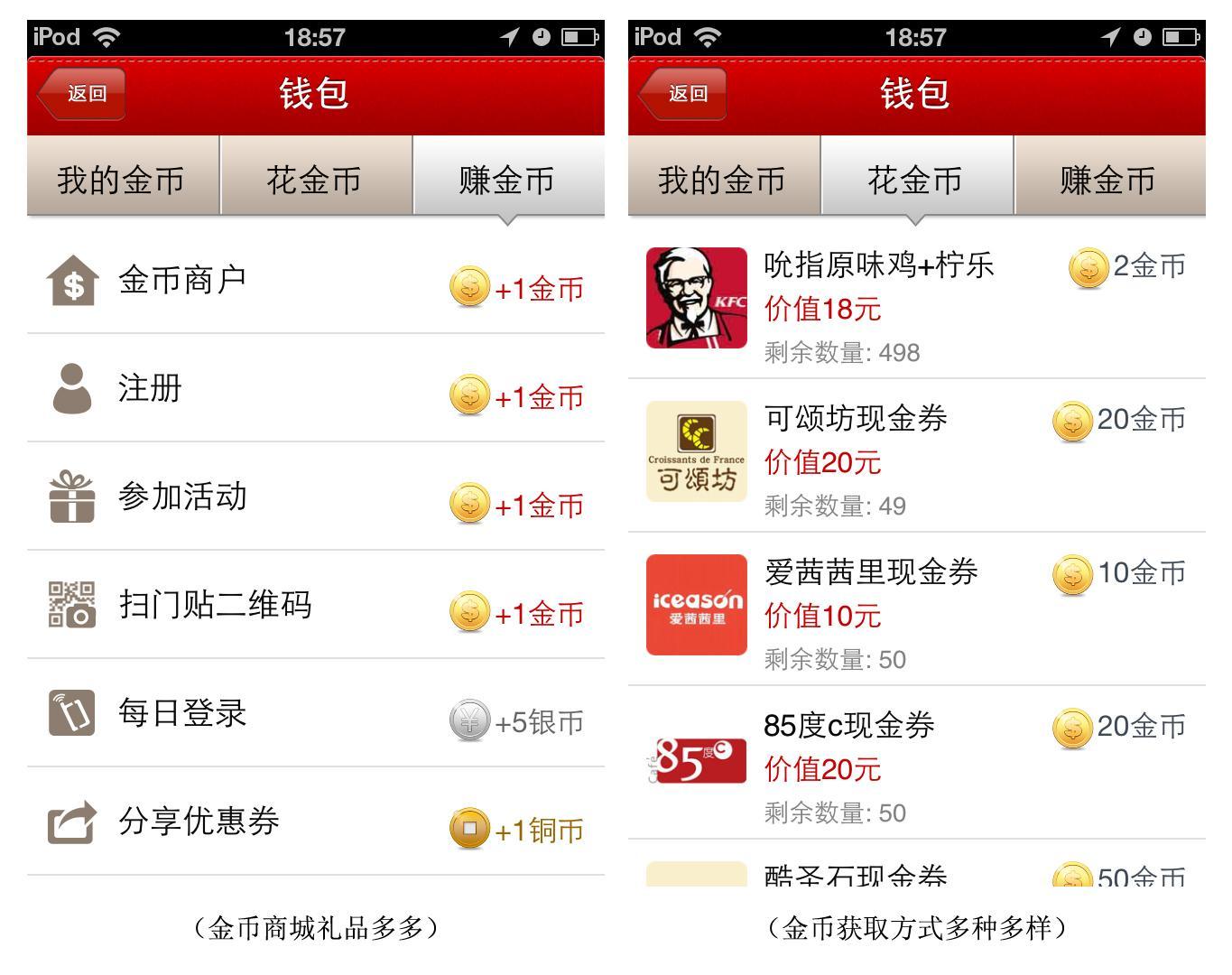 那么怎么獲得金幣呢?其實(shí)很簡(jiǎn)單,金幣的獲取也都是免費(fèi)的。例如,注冊(cè)新用戶可以獲得1金幣;每天首次登陸就有5銀幣到手;掃描商戶的二維碼門貼就有1金幣進(jìn)賬;通過短信或微博分享優(yōu)惠券也能賺到1銅幣。