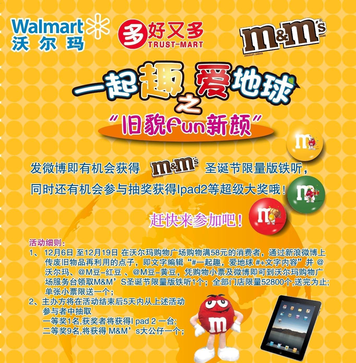 天冷了,宅在家里參加沃爾瑪與瑪氏公司共同推出的一起“趣”愛地球的微博活動(dòng),也是別有一番樂趣。即日起至12月19日,顧客在沃爾瑪和好又多門店購物滿58元后,通過微博上傳廢舊物品再利用的點(diǎn)子,即編輯文字“#一起趣,愛地球#+文字內(nèi)容”,并@沃爾瑪、@紅豆-Red、@黃豆-Yellow,便可以憑購物小票和微博到沃爾瑪和好又多門店服務(wù)臺(tái)領(lǐng)取m&m's圣誕節(jié)限量版鐵聽1個(gè)(全國門店限量52800個(gè),送完即止,單張小票僅限送一個(gè),詳情請(qǐng)見店內(nèi)海報(bào)或到顧客服務(wù)臺(tái)咨詢)?;顒?dòng)結(jié)束后5天內(nèi),從上述活動(dòng)參與者中還將抽取一等獎(jiǎng)1名,送出 iPad2一臺(tái);二等獎(jiǎng)9名,分別送出 m&m's 大公仔一個(gè)。