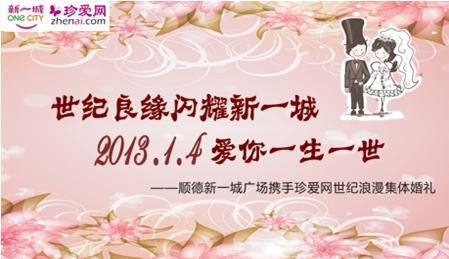 廣州2012年12月31日電 /美通社/ -- 在百年難得一遇的幸福起點,擁有真愛恒久流傳的浪漫回憶,是單身男女都期盼著的幸福人生。2013年1月4日,順德新一城攜手中國較大的相親網站珍愛網 (zhenai.com) 在佛山順德新一城廣場舉辦的“世紀良緣閃耀新一城,2013.1.4愛你一生一世”世紀浪漫集體婚禮即將濃情啟幕,為新人締造一場甜蜜浪漫的世紀回憶。