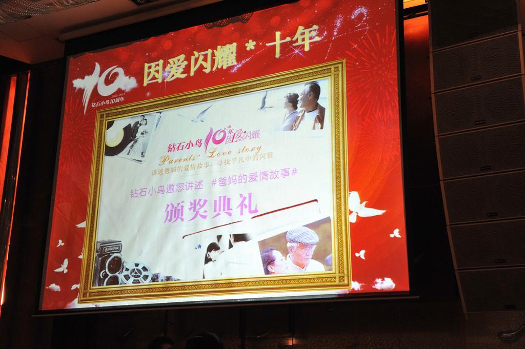 一位來自浙江紹興叫陸丹的女孩,在@鉆石小鳥上看見,鉆石小鳥征集“十年關于爸媽的愛情故事”,便將自己的父母的愛情故事以140字的微博參與了征集活動,最終在收集到的上千條愛情故事中,被ELLE、瑞麗、悅己等數家媒體作為具有代表性的平凡人的愛情故事挑選出來,這位女孩兒和她的父母都被特別邀請到鉆石小鳥品牌十周年的慶典現場。