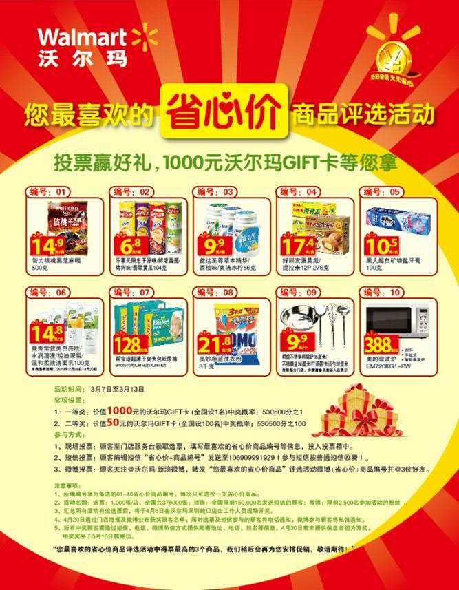 深圳2013年3月7日電 /美通社/ -- 繼去年11月,全國范圍的沃爾瑪購物廣場及好又多門店推出“上千種省心價(jià)商品如您所需”的活動后,3月7日起,沃爾瑪再次推出上千種“省心價(jià)”商品,包括食品、日用品、家庭用品等品類。同時(shí),3月7日至13日,沃爾瑪邀請顧客參與“您最喜歡的省心價(jià)商品評選活動”,顧客通過在門店填寫選票、發(fā)送短信、轉(zhuǎn)發(fā)微博的方式,在10個(gè)備選商品中為自己心儀的“省心價(jià)”商品投上一票,就可參加幸運(yùn)抽獎,贏取面值1000元的沃爾瑪 GIFT 卡。獲得顧客投票數(shù)最多的前3名“省心價(jià)”商品,沃爾瑪還會為顧客提供后續(xù)的促銷。