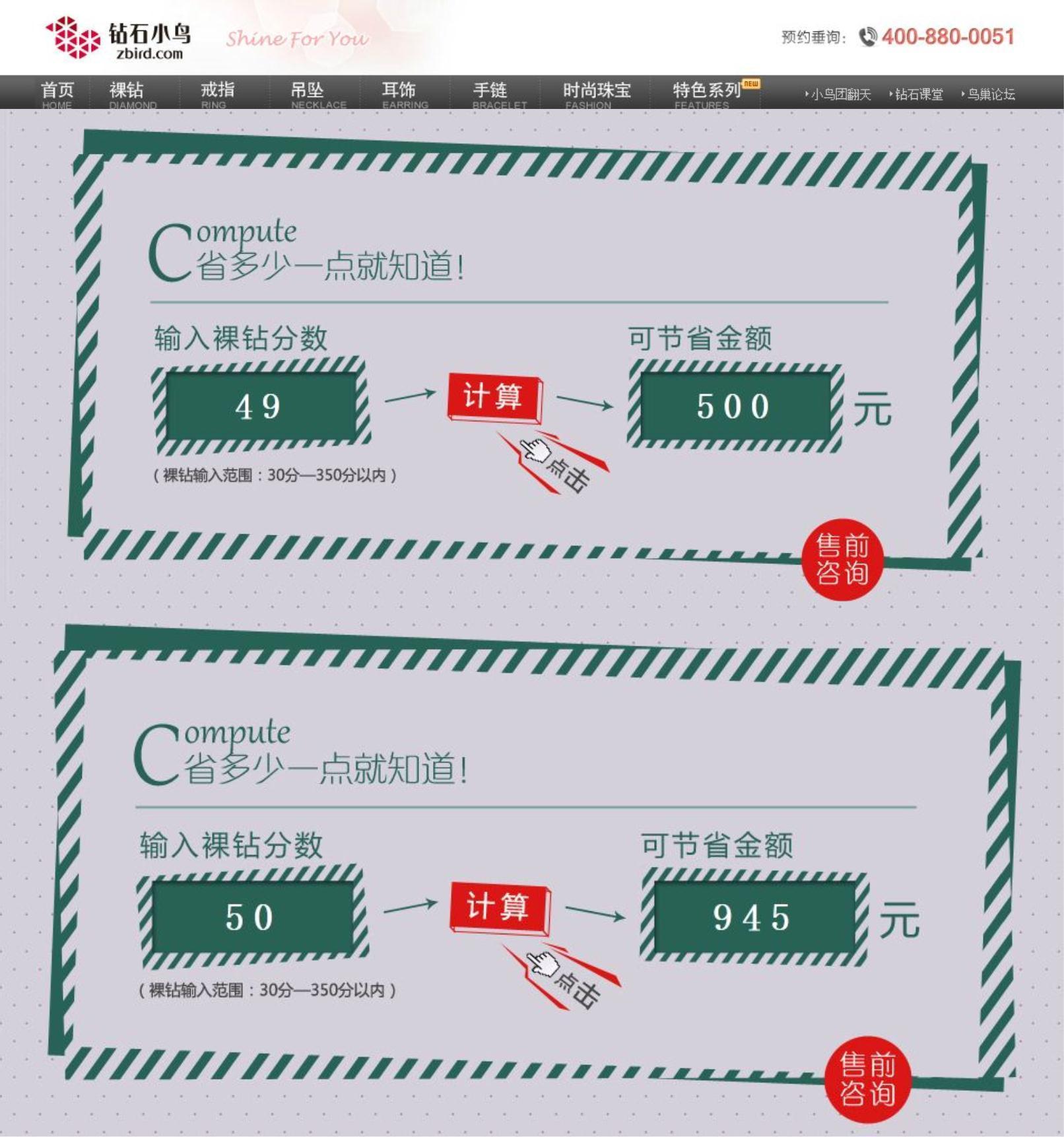 上海2013年4月24日電 /美通社/ -- 日前,在微博上,網友爆料珠寶品牌鉆石小鳥五一促銷活動規則有漏洞可鉆,通過鉆石小鳥官網(www.zbird.com )愛情公式計算,50分的裸鉆比49分的裸鉆優惠額度更省一半。