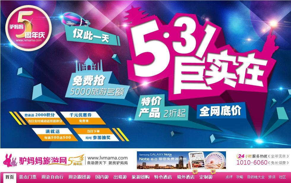 而且,驢媽媽這次在5周年店慶促銷時間選擇上,也頗費心思。5月31日這個節點,恰好正逢6月旅游消費的小淡季,同時又趕在迎接暑期旅游高峰前,此時進行整合營銷造成規模效應,這對淡季促銷和暑期預熱起到雙重作用,對消費者來說也能得到實際優惠。