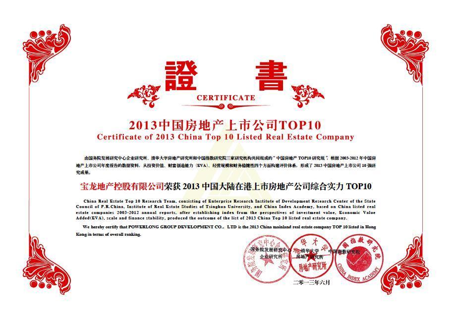 上海2013年5月31日電 /美通社/ -- 2013年5月31日,2013中國房地產上市公司研究成果發布會暨第十一屆中國房地產投融資大會在中國證券監督管理委員會北京會議廳盛大召開。寶龍地產(HK.1238)再次獲得“2013大陸在港上市房地產公司綜合實力十強”、 “2013中國大陸在港上市房地產公司財務穩健性十強”兩大獎項。
