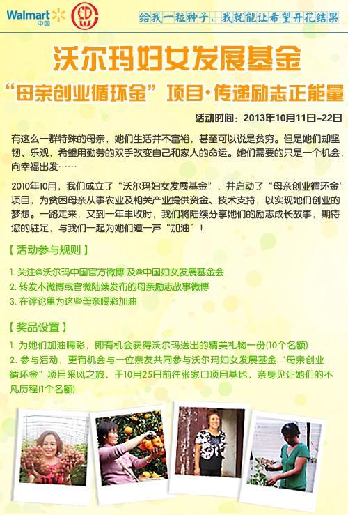 深圳2013年10月14日電 /美通社/ -- 近日,沃爾瑪中國在官方微博(@沃爾瑪中國官方微博,http://weibo.com/wmcsr)上線“為創業母親喝彩,傳播勵志正能量”慈善主題活動,講述在沃爾瑪“母親創業循環金”項目幫助下,貧困母親的勵志創業故事;并號召網友參與互動,為這些通過辛勞改變自己和家人命運的母親們喝彩。網友參與微博活動,即有機會贏取精美禮物,還有可能被選中參與沃爾瑪“母親創業循環金”項目采風之旅,前往張家口項目基地,見證創業母親的成長歷程。