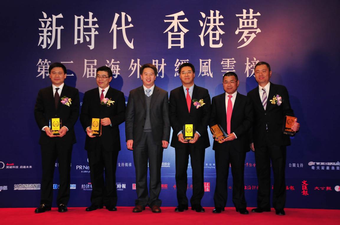 2013第二屆海外財經風云榜海外財經風云人物獎項頒布。嘉賓左起:香港中資證券業協會會長 閻峰、建銀國際總裁 胡章宏、香港中聯辦經濟部副部長 孫湘一、香港中國金融協會主席 陳爽、民生銀行香港分行副行長 陸中云、海通國際行政總裁 林涌。