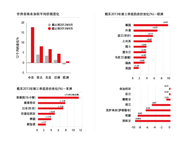 截至2013年3季度,全球房市已現拐點,總體表現自2006/7峰期以來較佳。多數國家房價呈攀升之勢;其中一些國家二線城市相對宏觀市場正經歷更快速的增長。