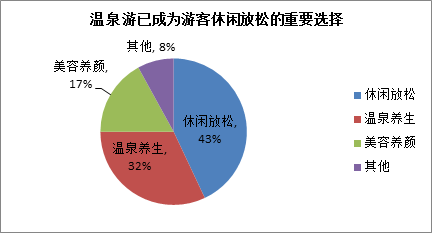 溫泉游已迎來了發(fā)展的黃金期,據(jù)驢媽媽相關調(diào)查顯示,超過43%的游客將溫泉游作為休閑放松的首選目標、32%的游客青睞于溫泉養(yǎng)生、17%的游客選擇美容養(yǎng)顏、8%的游客選擇其他。由此可見,休閑放松已成為游客選擇溫泉游的重要目的。
